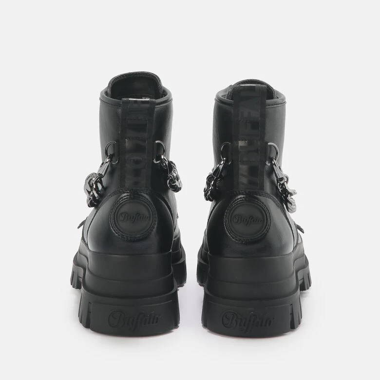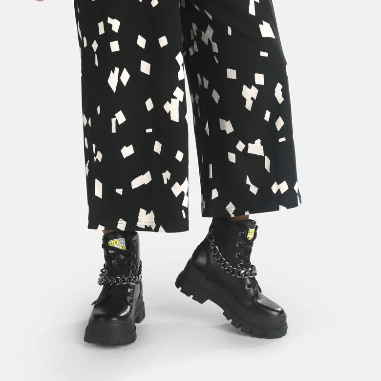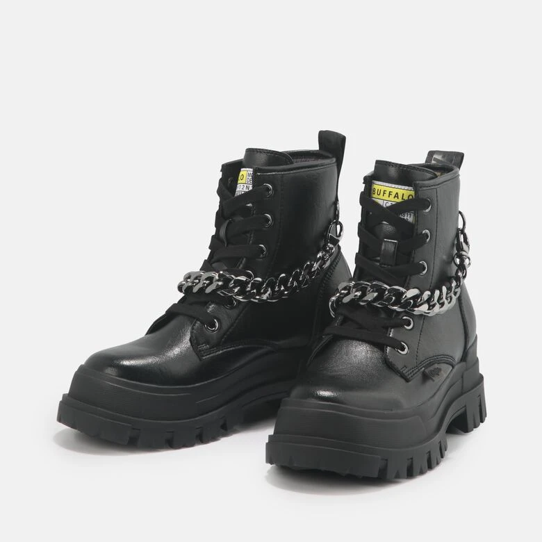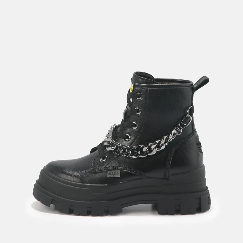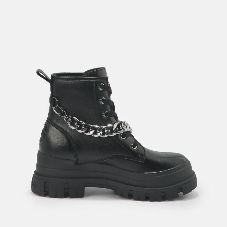 Mit dem Aspha Chain Ankle-Boot zeigst Du, dass Du modisch alle Ketten sprengst. Das All-Black-Design und die chunky Plateausohle machen diesen Combat Boot zum absoluten Headturner. Neben cool kann der heiße Treter auch glamourös, was die plakative Gliederkette in Silber gekonnt zur Schau stellt. Ein Must-have für stilbewusste Rockergirls!